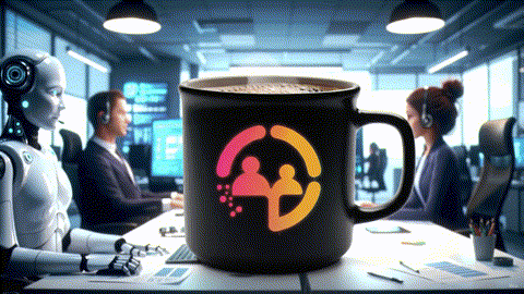 Prompt: Create a hot steaming cup of coffee with a colour changing data logo on the outside with a blurred background of an office with robots and humans sitting at desk wearing headsets.